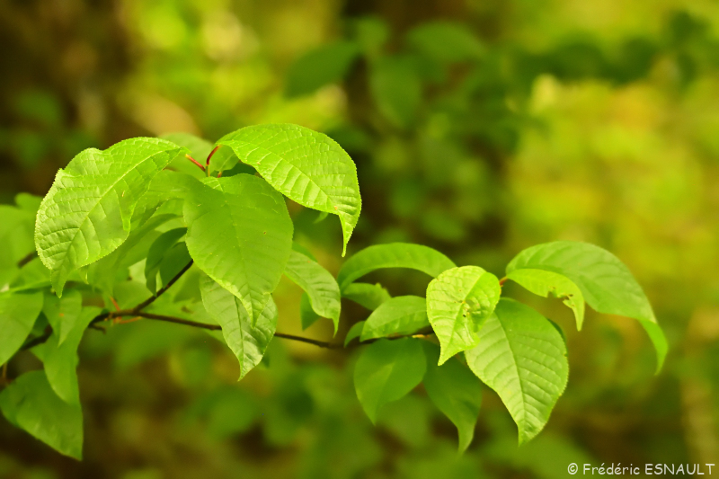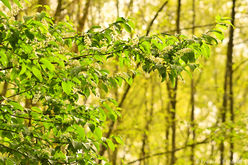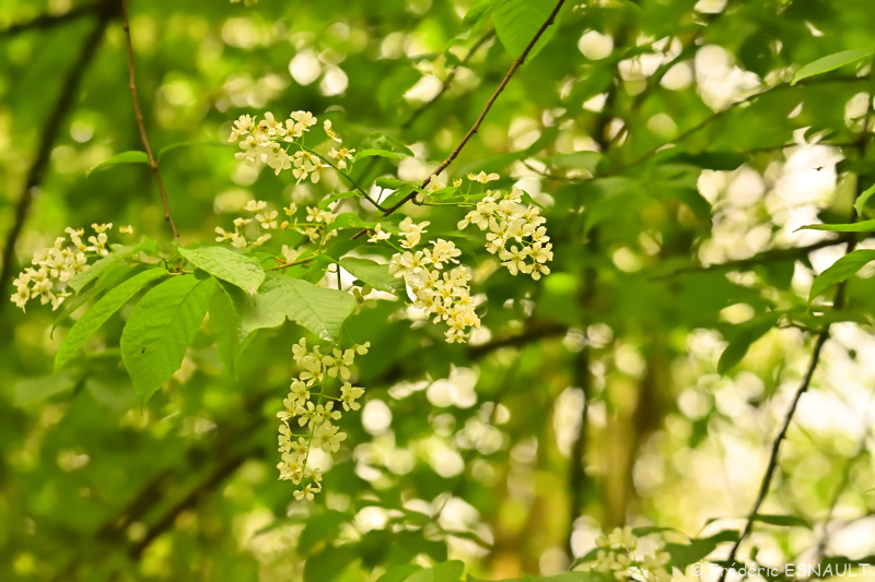 Le Cerisier à grappes ou Merisier à grappes (Prunus padus) pousse dans le bois humide de l’étang de la Loy de la vallée de la Brosse.