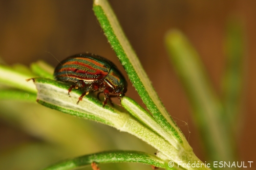 La Chrysomèle du Romarin (Chrysolina americana) se trouve dans les jardins et est inféodée à la plante du même nom.