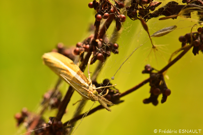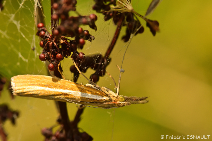 Son petit cousin, le Crambus des pâturages (Crambus pascuella), est également présent.