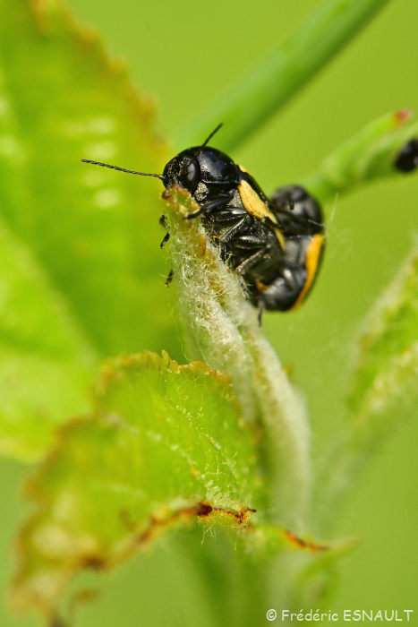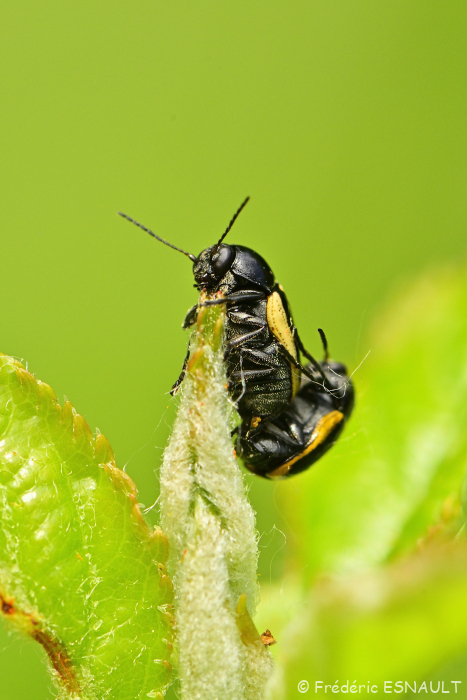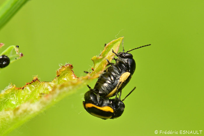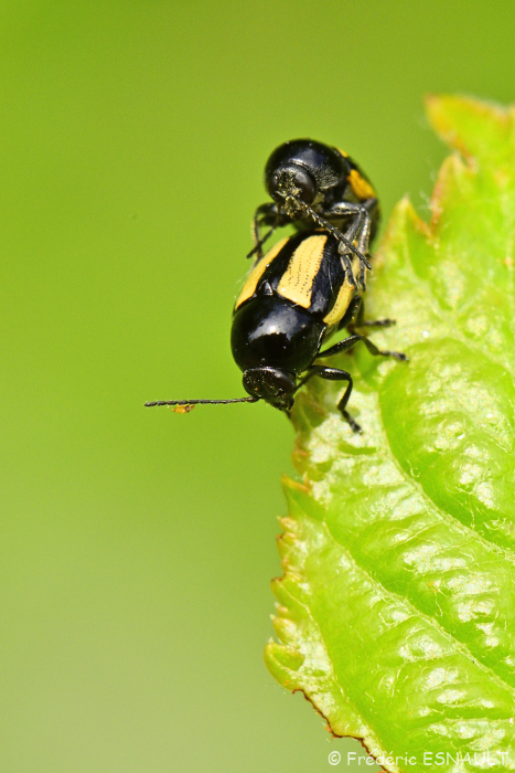La chrysomèle Cryptocéphale à bandes blanches (Cryptocephalus vittatus) vit dans les champs aux abords de l’étang de la Loy dans la vallée de la Brosse.