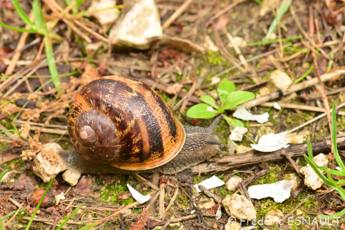 L’Escargot petit-gris (Cornu aspersum) vit dans le bois de l’étang de la Loy dans la vallée de la Brosse.