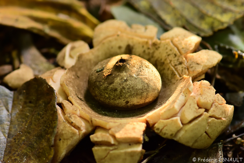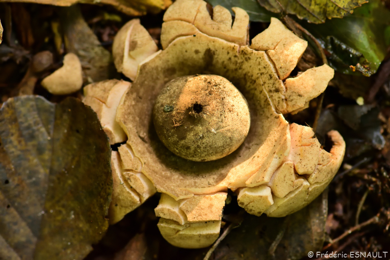 Découvert au pied d’un bel Hêtre du parc du château de Rentilly, ce champignon particulier possède un nom très parlant : l’Étoile de terre (Géastrum triplex). Les scientifiques lui préfèreront son appellation de Géastre plus conforme au genre auquel il se rapporte (Geastrum).