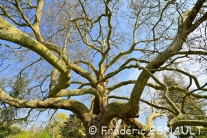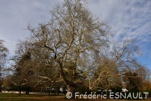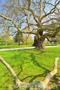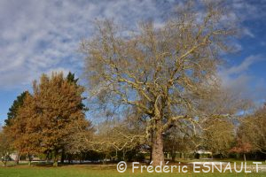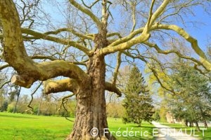 Le Platane commun ou Platane à feuilles d’érable (Platanus × hispanica) pousse dans le parc du château de Rentilly de la vallée de la Brosse.