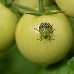 Une larve de la Punaise verte ponctuée (Nezara viridula) se délectant d’une tomate verte derrière le bois de l’étang de la Loy.