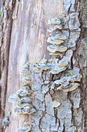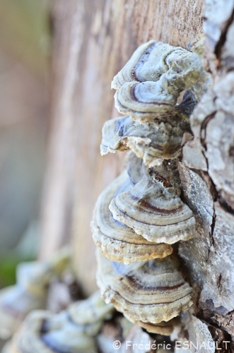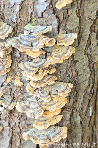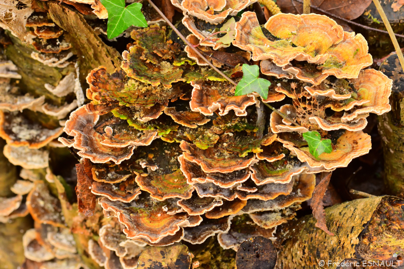 La Tramète versicolore ou Tramète à couleur changeante (Trametes versicolor) pousse sur les arbres dans la vallée du ru de la Brosse.
