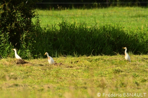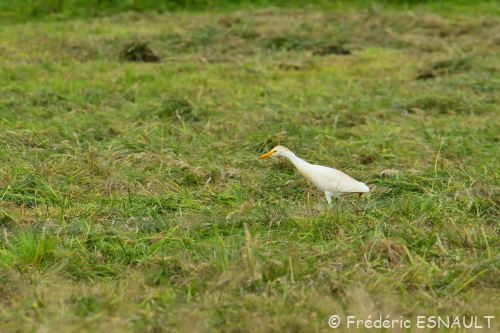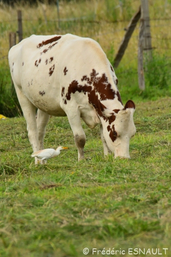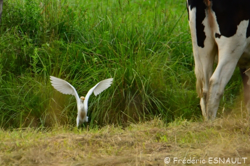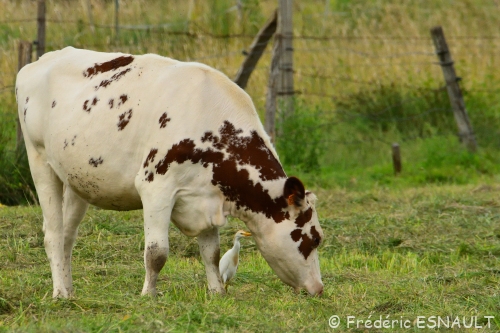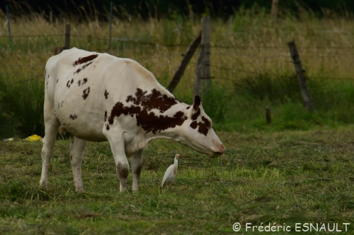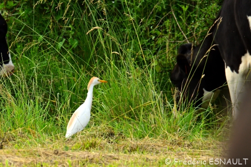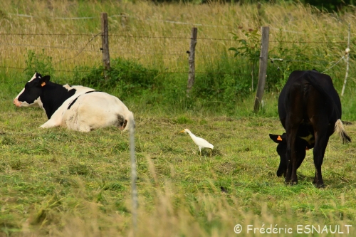 Le Héron garde-bœufs (Bubulcus ibis) est de toujours dans les champs de bocage au milieu du bétail, ici ceux de la ferme de Saint-Thibault-des-vignes de la vallée du ru de la Gondoire.