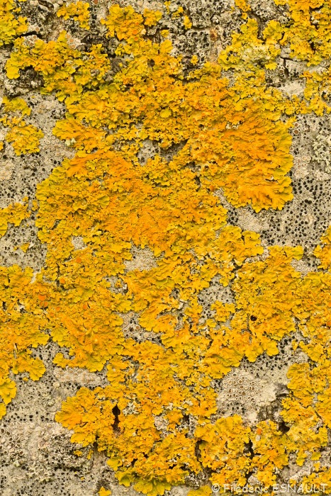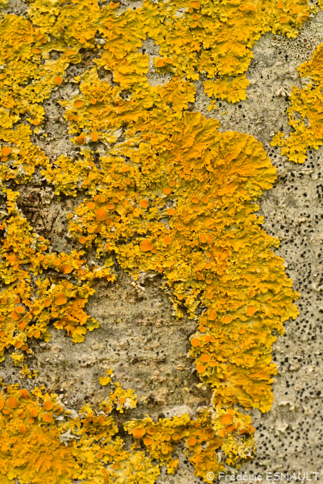 Le Lichen encroûtant jaune ou Parmélie des murailles (Xanthoria parietina) pousse notamment sur les Noyers de la vallée de la Brosse.