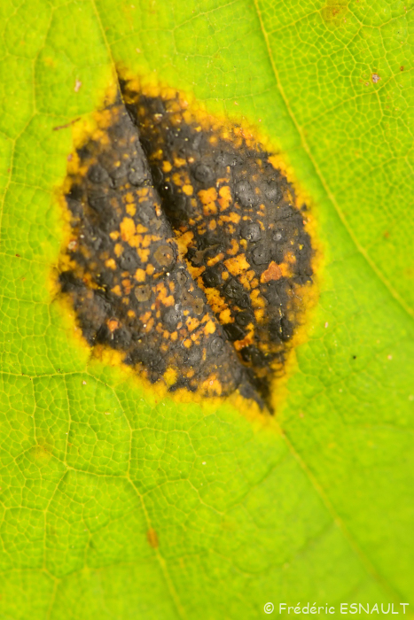 La Maladie des croûtes noires (Rhytisma acerinum) est un champignon qui se développe sur les feuilles d’Érables (Acer) du bois de l’étang de la Loy de la vallée du ru de la Brosse.