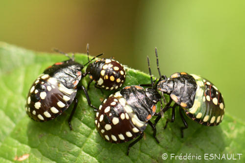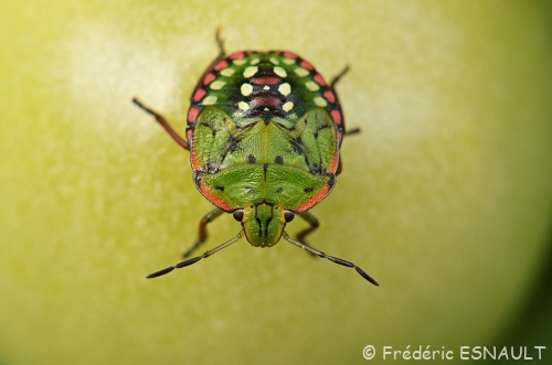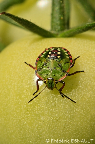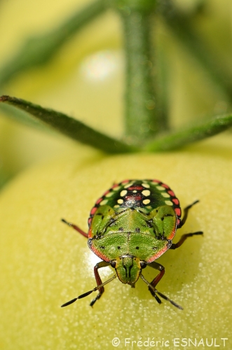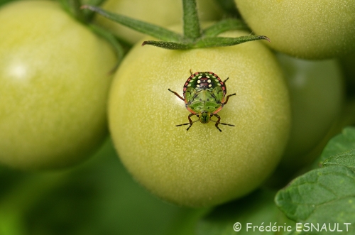 Une larve de la Punaise verte ponctuée (Nezara viridula) se délectant d’une tomate verte derrière le bois de l’étang de la Loy.