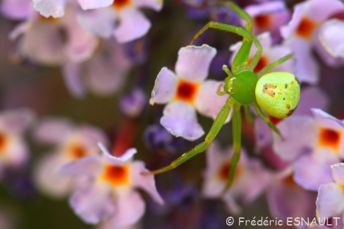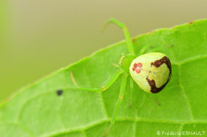 L’Araignée-crabe Thomise à trois taches (Ebrechtella tricuspidata) se cache sur les fleurs pour capturer ses proies. On la trouve dans la vallée du ru de la Brosse.
